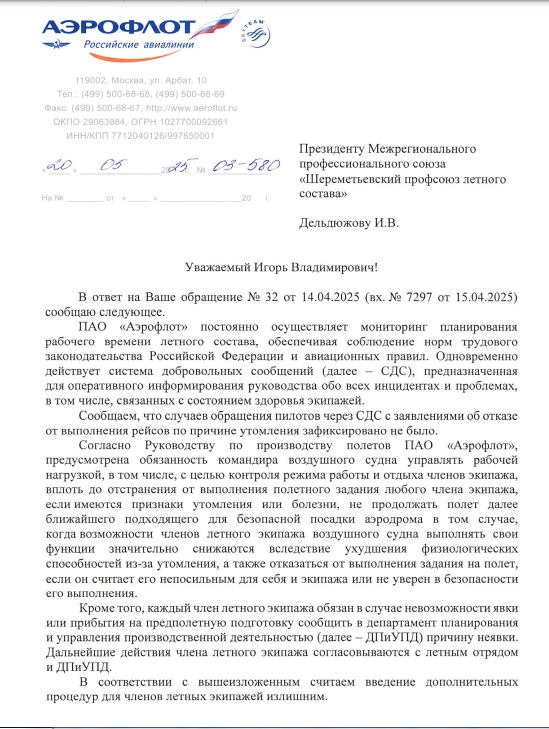 Профсоюз направил в администрацию «Аэрофлота» следующие вопросы: