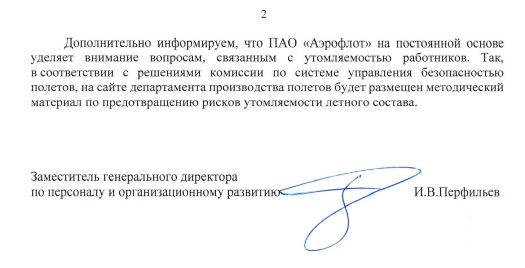 4.ПАО «Аэрофлот» на постоянной основе уделяет внимание вопросам, связанным с утомляемостью работников. Так в соответствии с решениями комиссии по системе управления безопасностью полетов, на сайте департамента производства полетов будет размещен методический материал по предотвращению рисков утомляемости летного состава.