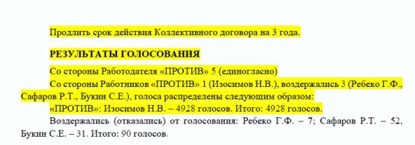 28.11.2025 проводится заседании комиссии по регулированию социально трудовых отношений ПАО «Аэрофлот», где был поставлен вопрос Продлить срок действия Коллективного договора на 3 года и Изосимов Н.В. представляющий 4928 со стороны работников проголосовал ПРОТИВ. Представители от ППО ЛО А-320, ППО ЛО В-777, ПриАС отказались участвовать в голосовании, так как состав КРСТО, признанный нелегитимным, так и не был изменен и судебное разбирательство по данному вопросу не окончено, но КРСТО было достаточно голоса «ПРОТИВ» Изосимова Н.В.