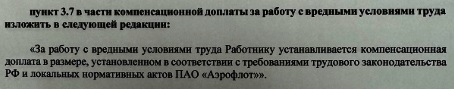 «За работу с вредными условиями труда Работнику устанавливается компенсационная доплата в размере, установленном в соответствии с требованиями трудового законодательства РФ и локальных нормативных актов ПАО «Аэрофлот».