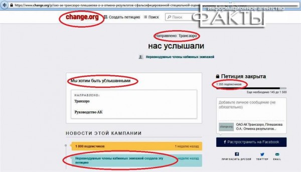 На 23 марта 2015 года под требованиями, адресованными в адрес генерального директора авиакомпании «Трансаэро» Ольги Плешаковой, подписалось 1355 человек.