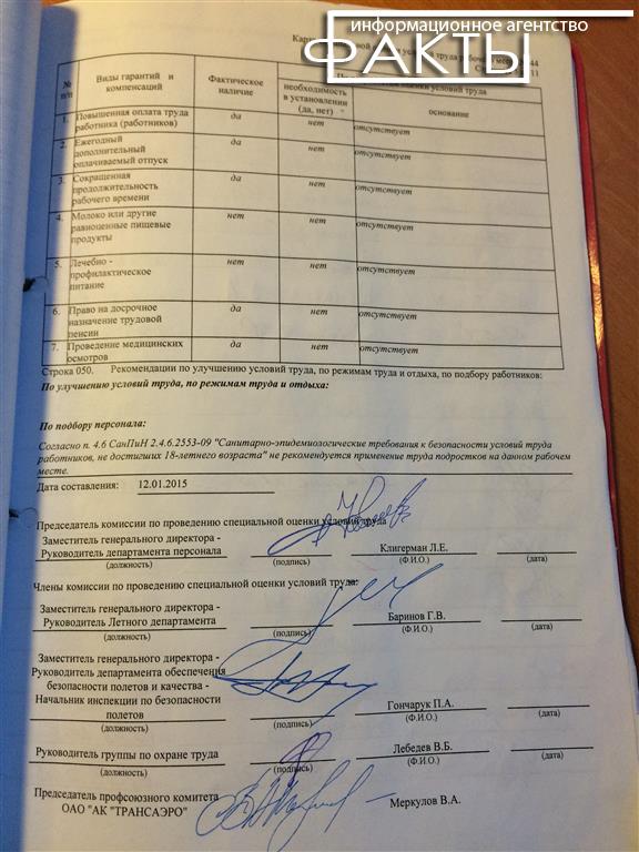 По данным профсоюза лётного состава в авиакомпании "Трансаэро" был издан Приказ генерального директора компании №557 от 09.02.2015 "об окончании работы комиссии по СОУТ на рабочих местах лётных и кабинных экипажей".