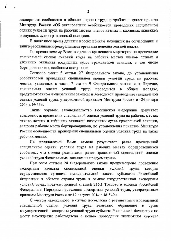 Летным и кабинным экипажам «Трансаэро» пришел ответ из Минтруда по вопросу проведения СОУТ в авиакомпании